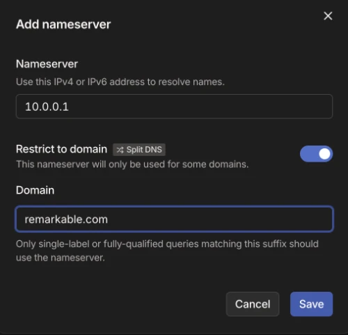 The thing that gave me the most trouble was hijacking DNS on iOS for when I’m not at home. I happen to use Tailscale, and it was what ended up solving this particular problem for me. Tailscale allows you to set up custom DNS servers for specific domains, called Split DNS. I set these up for the remarkable.com